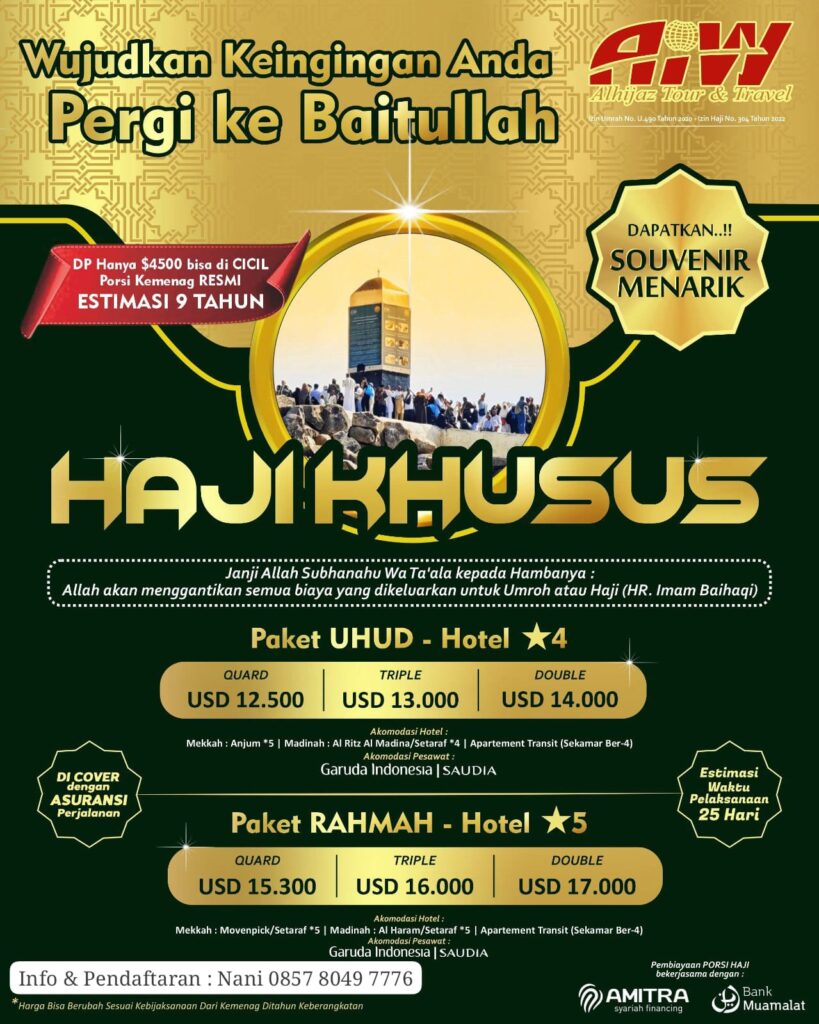Assalamuβalaikum Bapak/Ibu yang dirahmati Allah, Apakah Anda mendambakan berangkat ke Baitullah lebih cepat tanpa antrean puluhan tahun seperti Haji Reguler? Alhamdulillah, kini Alhijaz Wisata membuka pendaftaran Haji Khusus resmi dengan porsi Kemenag RI, estimasi keberangkatan hanya Β±9 tahun, jauh lebih cepat dari kuota reguler. π Apa Itu Haji Khusus Porsi Kemenag? Haji Khusus adalah program […]
